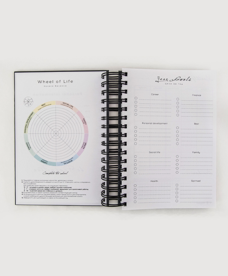 Еженедельник подойдёт тем, кому важно видеть целостную картину недели. Удобные блоки для каждого дня содержат оптимальное количество строк для записи задач на день. А полезный функционал, такой как планирование меню на неделю и треккер воды и полезных привычек помогут в поддержании здоровья и в достижении своих целей.