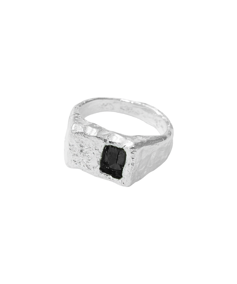 Массивное кольцо построенное на балансе объёма и линии. Сбоку — чёрный камень, смещённый от центра, как сознательный разрыв симметрии. Этот акцент не доминирует, а работает тонко, добавляя глубину и напряжение форме. Украшение ощущается как объект — самостоятельный, уверенный, вне времени и трендов.