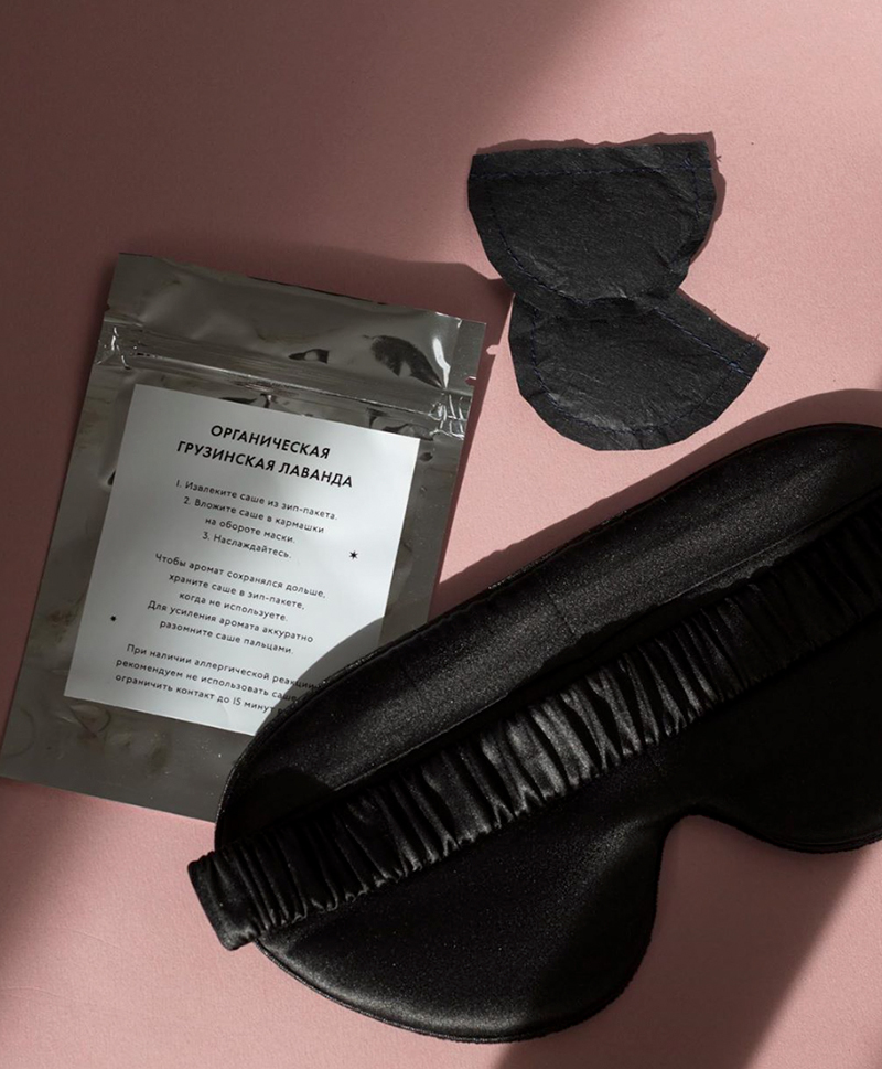 Маска для сна и медитации с ароматическим саше "Органическая грузинская лаванда". Роскошный чёрный бархат, чёрный шёлк. Натуральный шелк заботится коже, разглаживает мелкие морщинки и наполняет лицо сиянием, а хлопковый бархат дарит глубину цвета и долговечность изделия.Резинка универсального размера не давит на голову и не оставляет заломов на волосах, благодаря ширине и шелковому чехлу.