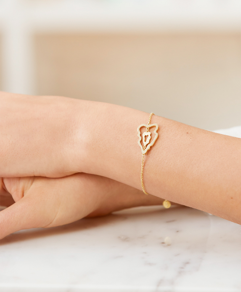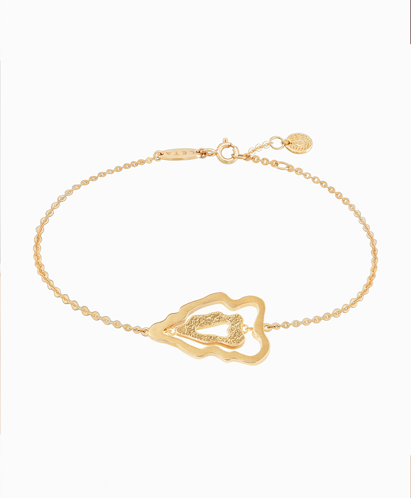 Сквозные детали браслета повторяют форму островов и озер, а проходящая насквозь цепочка символизирует воду и её движение. Размерный замок браслета с медальоном Leta позволит носить его с комфортом на любой руке.