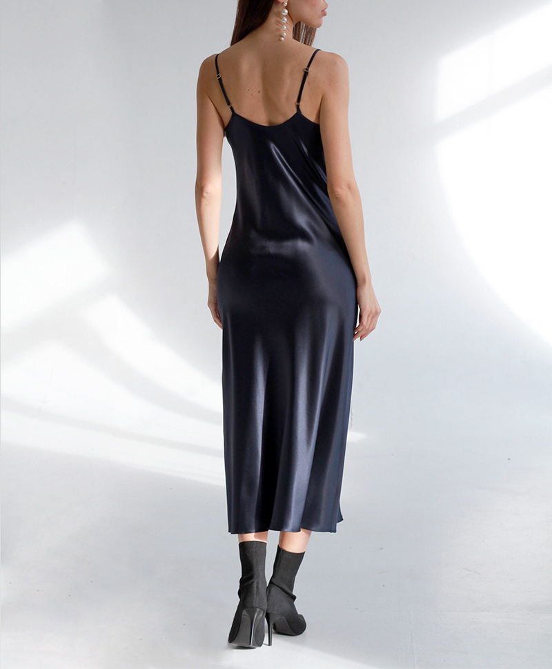 - 97% шёлк, 3% эластан;- узкие регулируемые бретели;- крой по косой, благодаря которому платье красиво садится на разные изгибы и не сковывает движений.