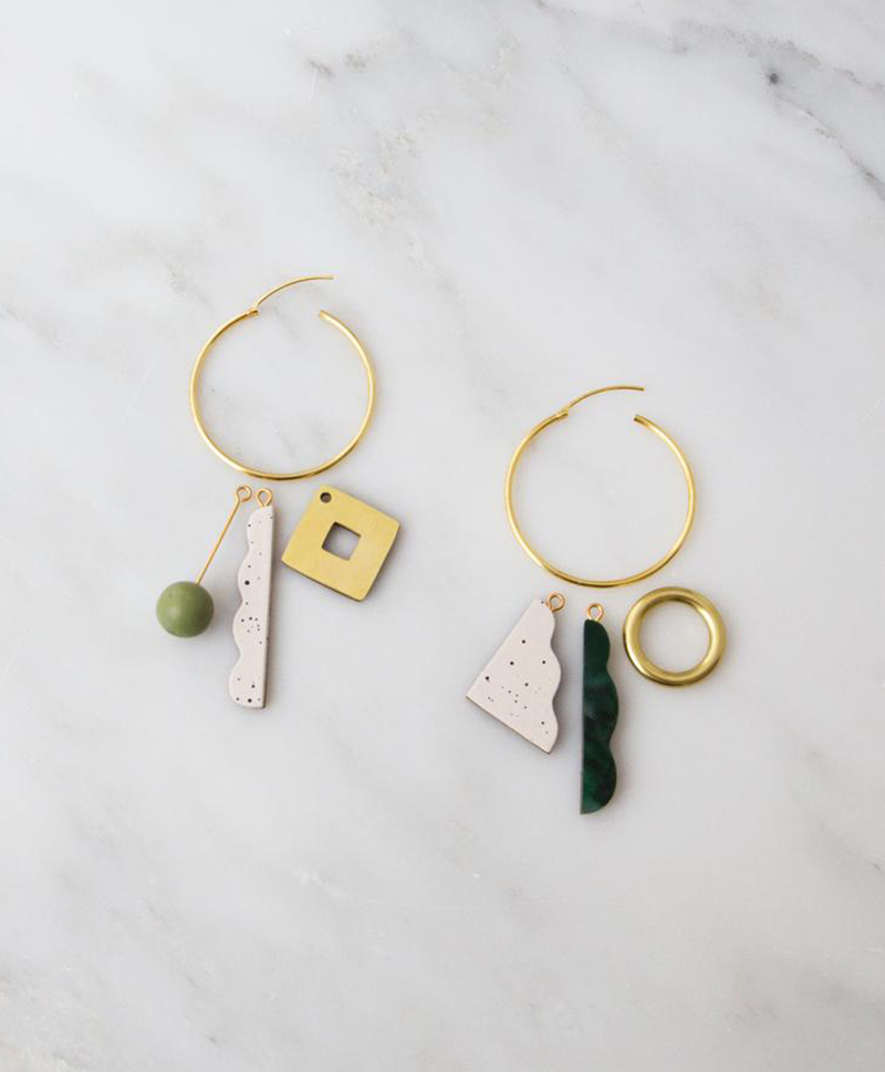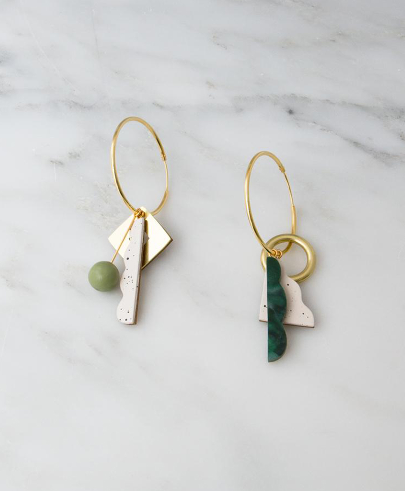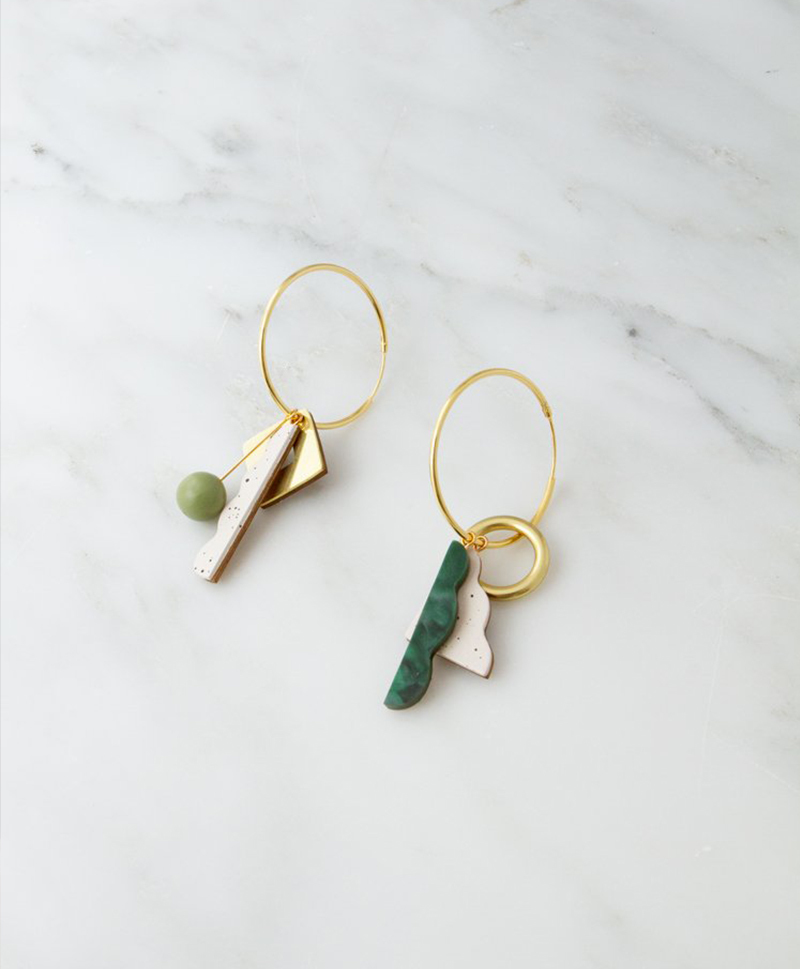 Геометрические серёжки из дерева и латуни c круглыми и полукруглыми элементами. Застёжка - гвоздик из серебра.