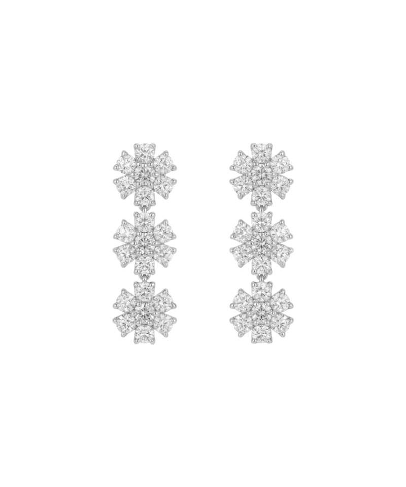 Серьги в форме цветка тройные с прозрачным камнем в центре и сияющими прозрачными камнями вокруг. Нежное украшение, которое легко впишется в любой образ.