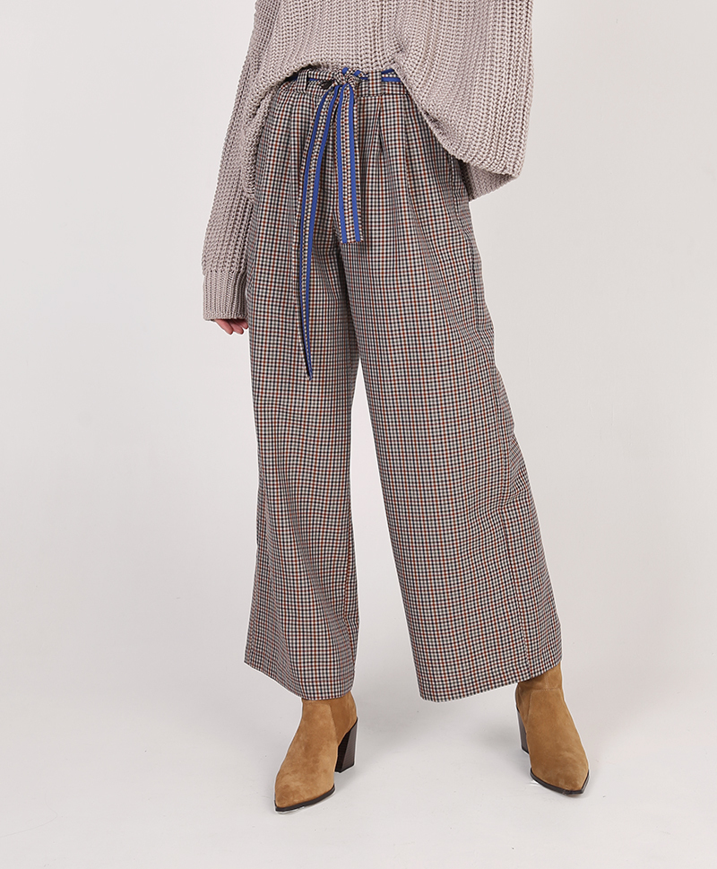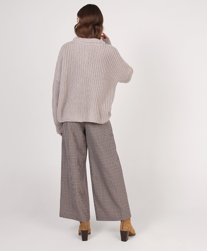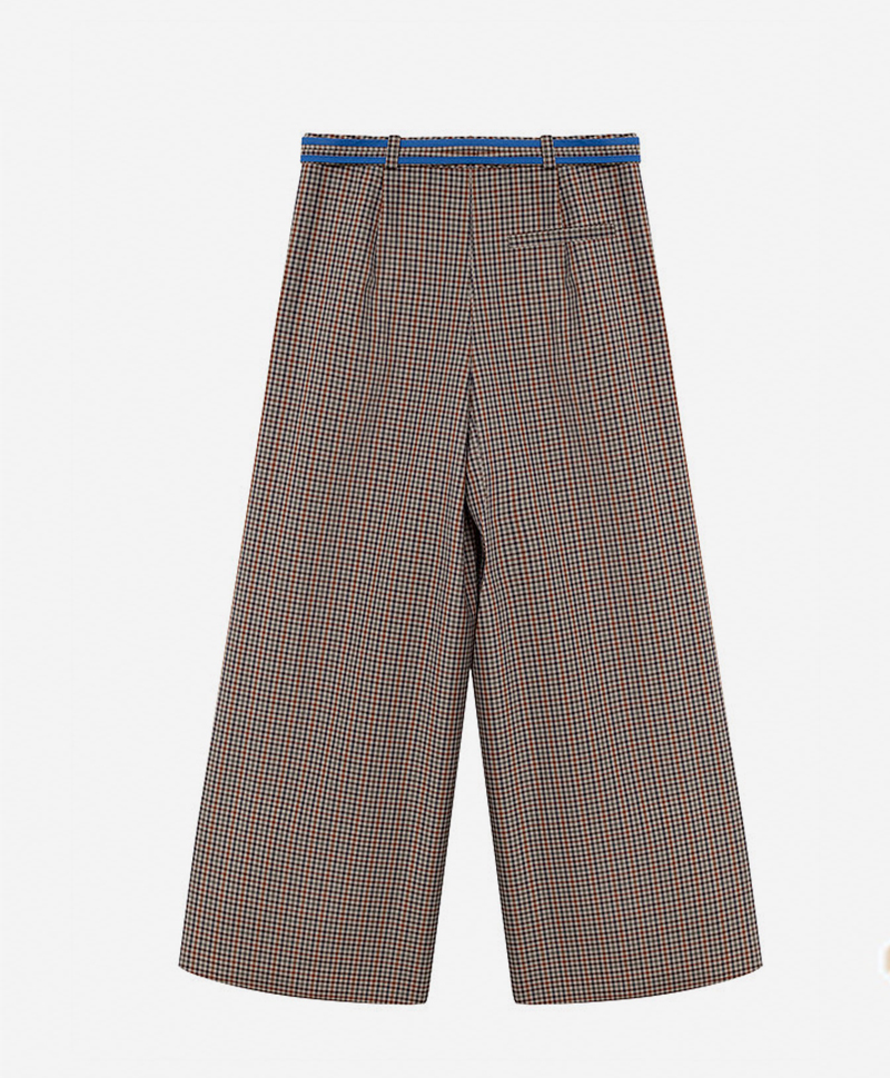Брюки с высокой посадкой, широкими штанинами, задним карманом и застежкой на молнию и пуговиц, в комплекте.
