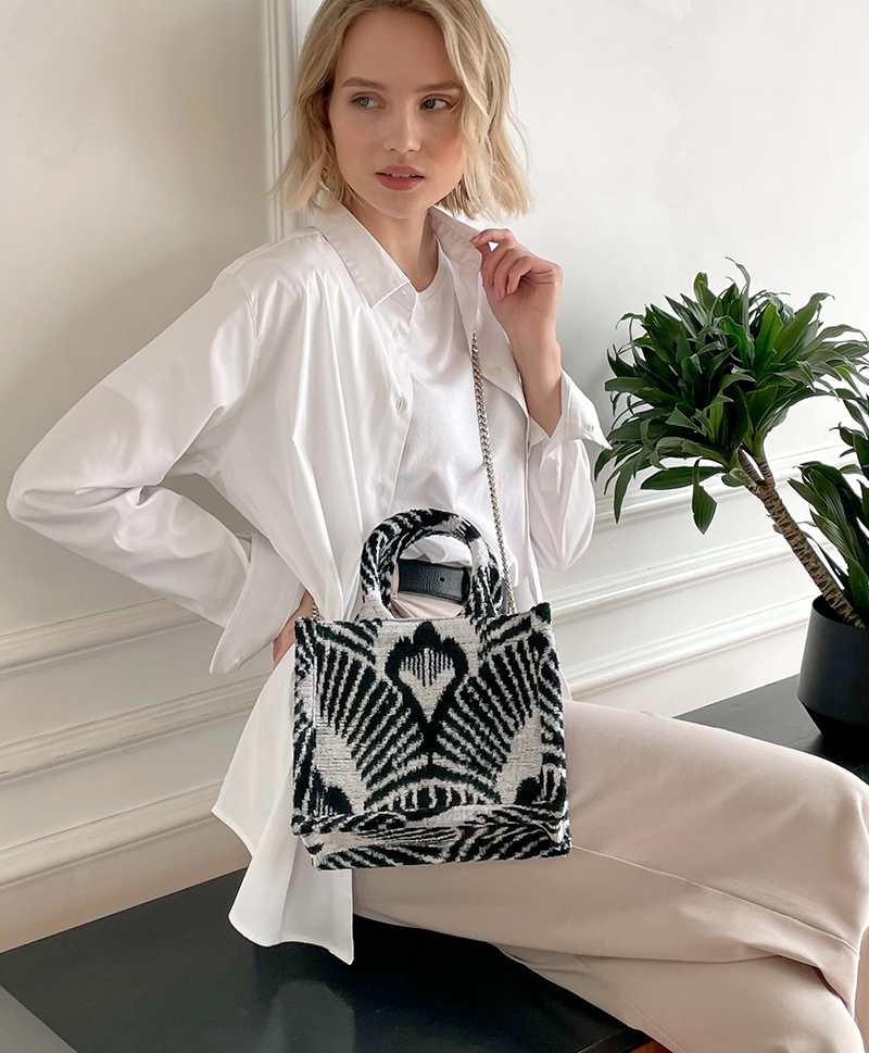 Стильная сумка-тоут из эксклюзивной натуральной шёлковой ткани, сотканной и окрашенной вручную. Можно носить в руках и на плече.Одно отделение, закрывается на магнитную кнопку.Внутри вместительный карман на молнии, в который помещаются паспорт и кошелёк, и три полукольца, для ремня и ключницы.