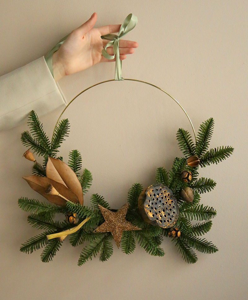 Венок ручной работы из искусственных елочных веточек с сухоцветами лотоса.