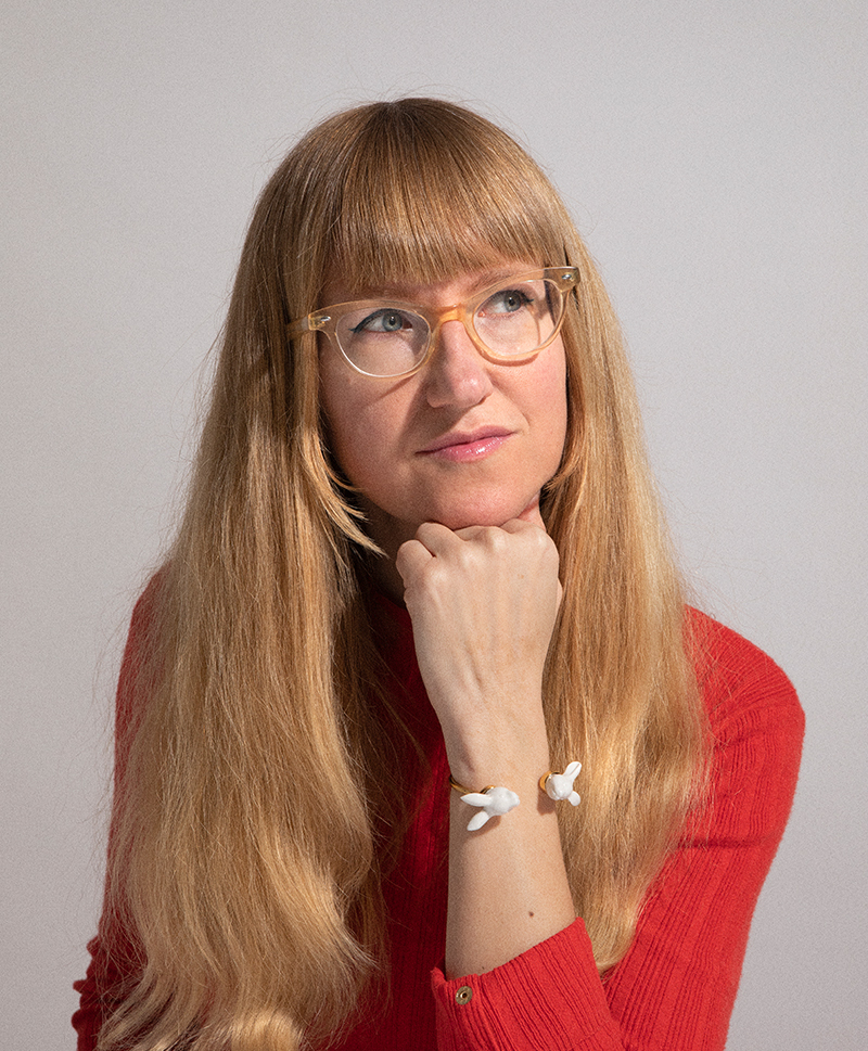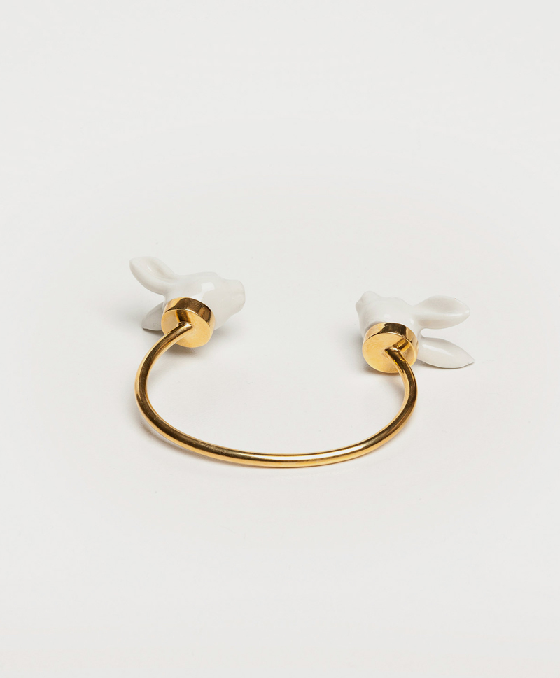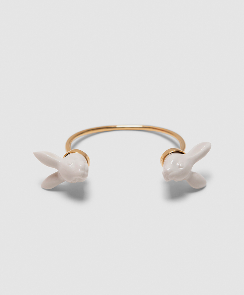 Испанский бренд Andres Gallardo с 2011 года удивляет мир своими фантазиями, воплощенными в украшениях из высококачественного фарфора и металла. В коллекции BLOOM дизайнер как всегда уделяет внимание геометрии: украшения дополняют детали шарообразной формы. Человеческий и животный мир дизайнер представляет настоящими мини-скульптурами в виде кулонов, серёг, брошей и, конечно, декора его знаменитых сумок. Колье на цепочке с подвеской в форме фарфорового кролика и сердца.